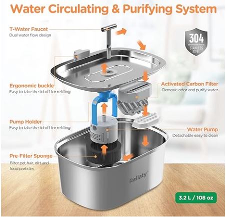 Cat Water Fountain Stainless Steel: 3.2L/108oz Pet Fountain Water Bowl Dog Drinking Dispenser Cat Feeding & Watering Supplies Animal Metal Kitty Spout for Cats Inside with 4 Replacement Filters